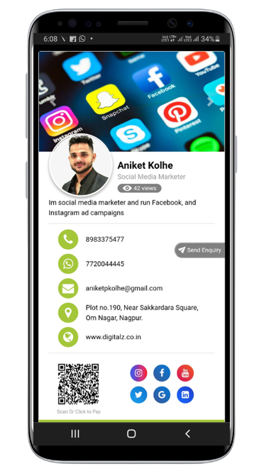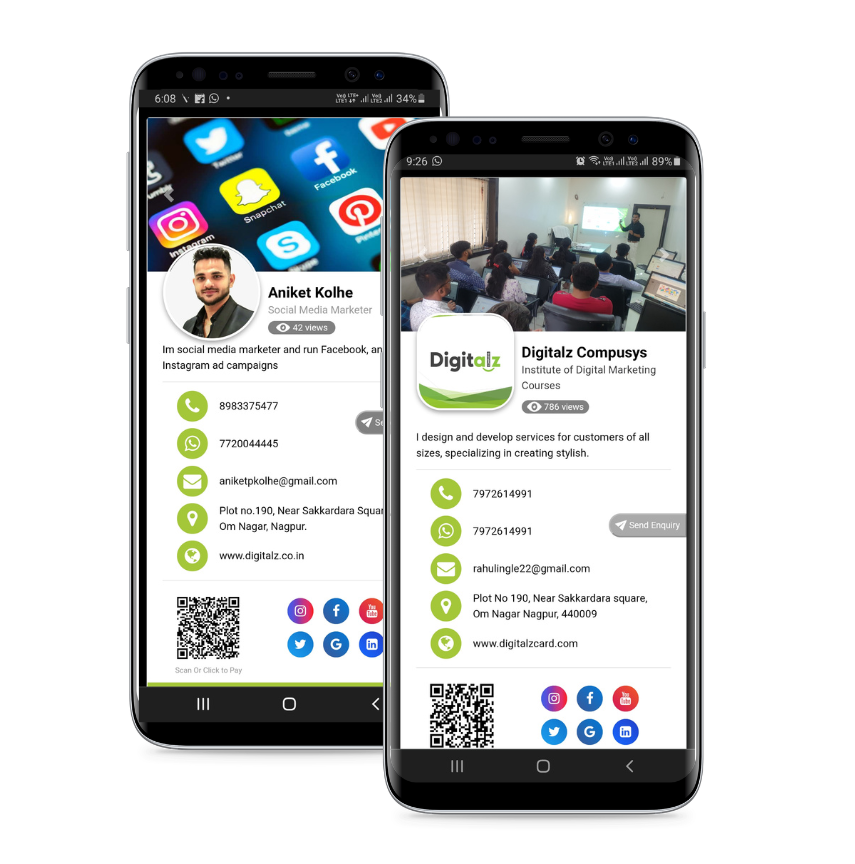 Digitalz Cards are also known as Digital Business Cards or Personal Cards, it can be created on IOS, Android or Computer & completely customized to fit your mobile screen, Digitalz Cards has unique features like, one click call, one click WhatsApp, get direction, website & social media links, payment options like UPI, QR Code, Google pay, PhonePe, mobile number etc.